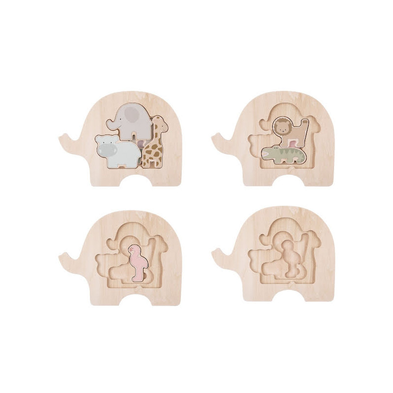 Ett lager-på-lager pussel i trä med sex olika safarifigurer. Pusselbitarna är extra greppvänliga för att passa små händer. Figurerna är också roliga att leka med. Pusslet har form av en elefant och bitarna består av olika safaridjur. Ett utmanande och annorlunda sätt att lägga pussel på.