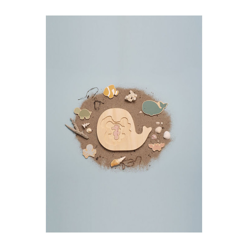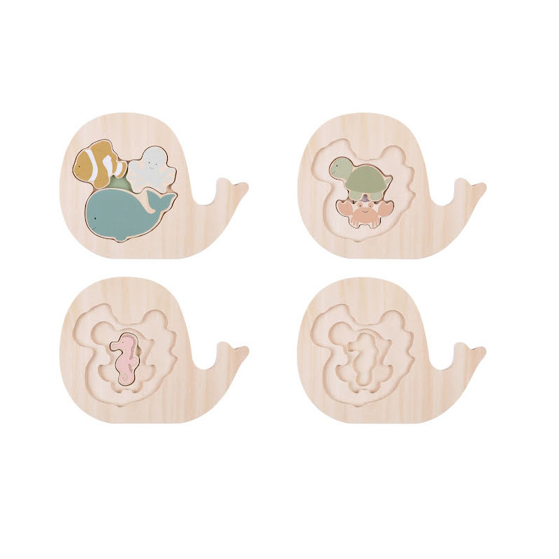 Ett lager-på-lager pussel i trä med sex olika safarifigurer. Pusselbitarna är extra greppvänliga för att passa små händer. Figurerna är också roliga att leka med. Pusslet har form av en elefant och bitarna består av olika safaridjur. Ett utmanande och annorlunda sätt att lägga pussel på.