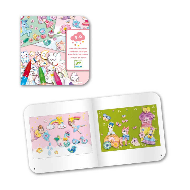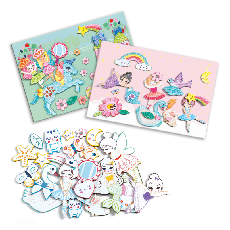 Charmiga stenciler, fina kritor och praktiskt limstift att använda för att skapa fina motiv fyllda med enhörningar, sjöjungfrur och tjejer i fina klänningar. Använd stencilerna om och om igen och varje teckning blir annorlunda beroende på hur du använder stencilerna.