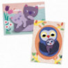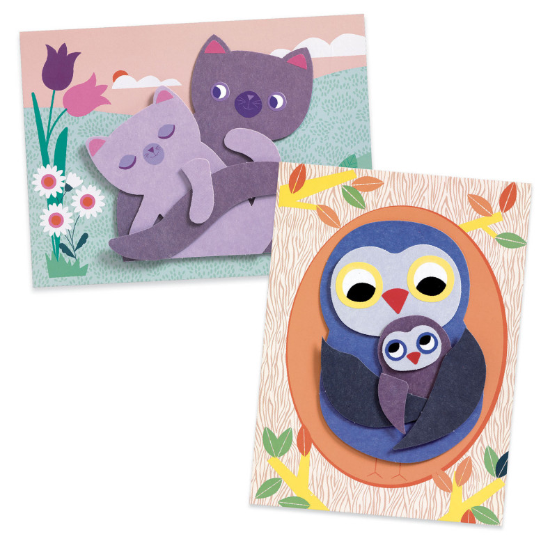 Ett pyssel-set för de yngsta med utstansade former och klistermärken som ska sättas ihop till söta, lätt tredimensionella bilder av djur som kramar sin unge. Med vackra, färgglada, tjocka papper som har utstansade delar med markeringar för var nästa lager ska placeras. Setet innehåller. . .