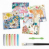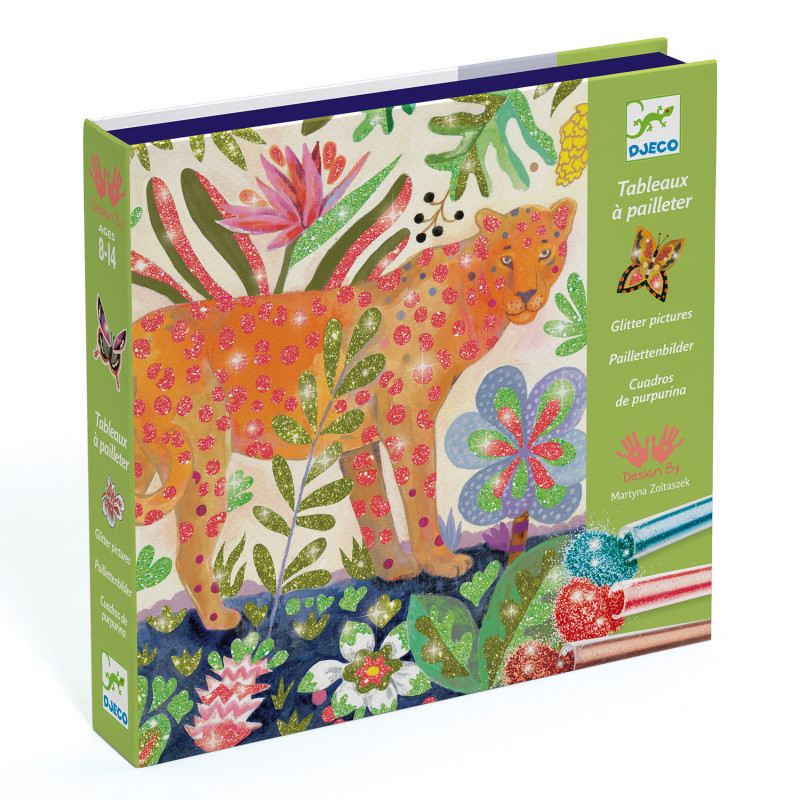 Färgglatt pysselset med djurtema. Här har du möjlighet att dekorera den fina förtryckta korten med sin klistriga yta med glitter. Fyra färgstarka motiv finns i förpackningen. Förpackningen innehåller dessutom 5 tuber med glitter, 1 verktyg använda, 1 pensel och en instruktionsbok. . .