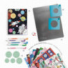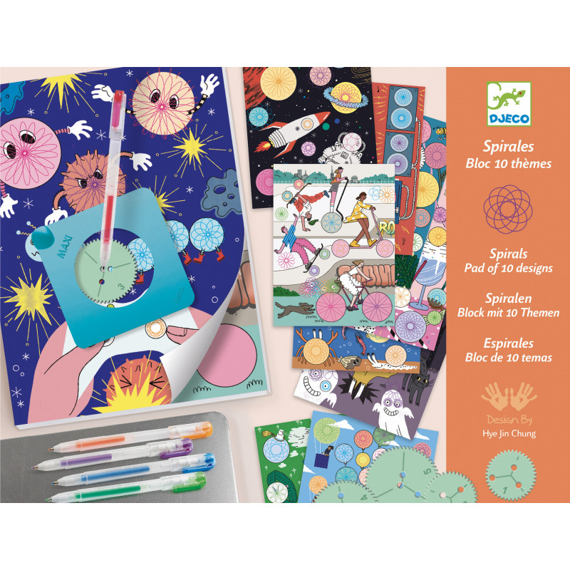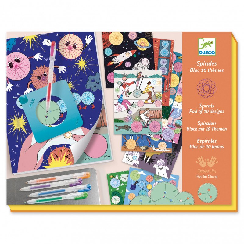 En ny twist på den gamla metoden med att rita spiraler - här använder man en platta i metall och magnetiska stöd för att hålla pappret på plats medan man ritar fina spiraler där man vill ha dem. I paketet får du en metall platta (21x29,5 cm), 2 magnetiska stöd/mallar, 5 olika tandade cirklar med hål för pennan på olika ställen, 5 pennor i olika färger, ett block med 30 illustrerade sidor (på 10 olika teman) med plats för spiraler, samt en bok med tips för att få fram snygga effekter. . Storlek på bilderna. .