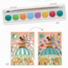 Färglägga: en illustrerad bild med vita områden att färglägga, 1 palett med 8 olika opaka vattenfärger/gouache samt en pensel,