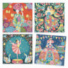 Ett härligt glittrigt pyssel med vackra och fantasifulla bilder av kvinnor omgivna av vackra detaljer ur sina dagdrömmar och klädda i fantastiska klänningar. Använd det lilla verktyget till att pilla bort skyddspappren märkta med en viss siffra för att frigöra en självhäftande yta redo att ta emot glitter i en viss färg. Borsta bort överflödigt glitter med penseln och häll tillbaka det i rätt rör med hjälp av hålet i asken. Setet innehåller. .