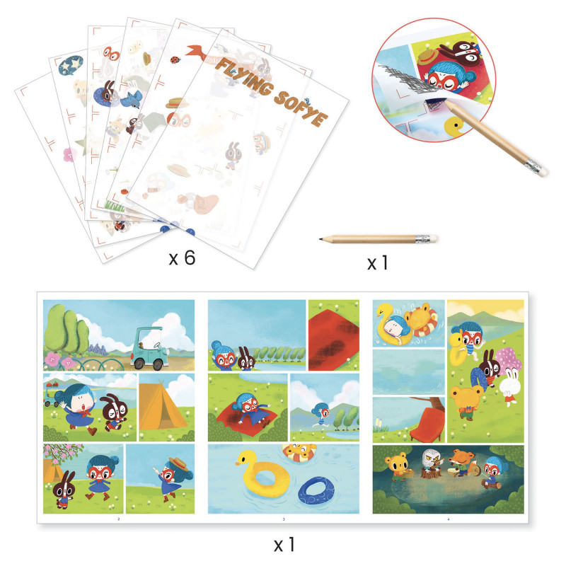 Ett kul set där du kan sätta ihop en tecknad serie med hjälp av rub-on bilder som du placerar där du vill på den illustrerade bakgrunden som är indelad i rutor och sedan överför du bilden genom att gnugga en penna över den. Med över 100 olika kul och älskvärda bilder att välja mellan kan du sätta ihop din alldeles egna historia om tjejen Sofye och hennes söta vänner. Innehåll. . .