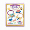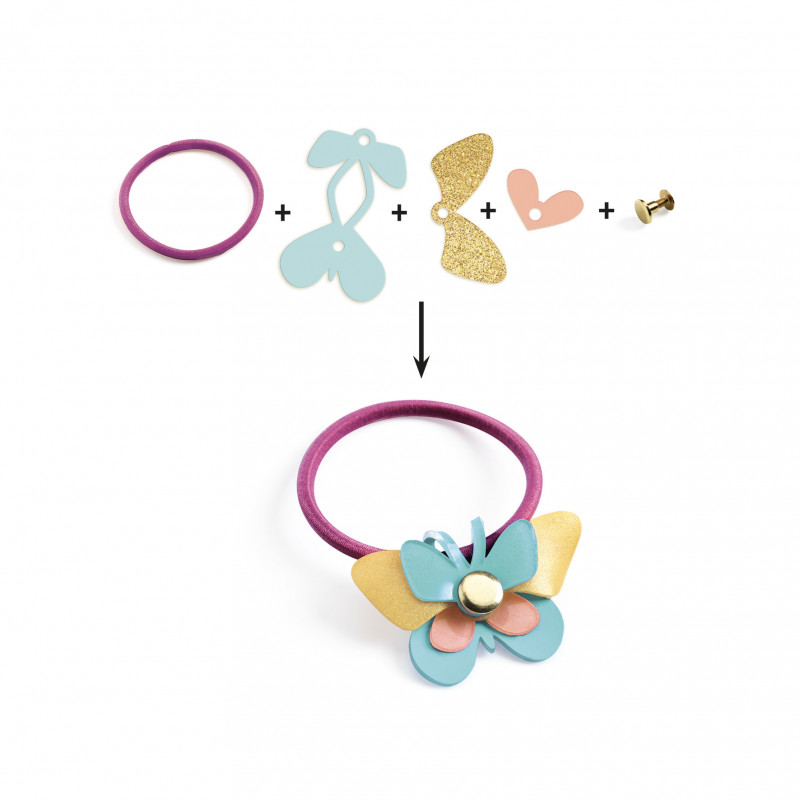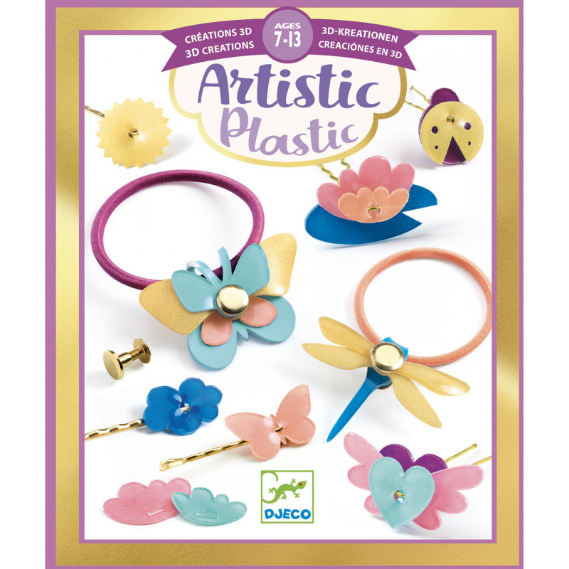 Ett kul set för att göra snygga hårdekorationer av magisk plast. Du kan skapa två hårsnoddar, fyra hårnålar och tre öppna hårnålar, alla med dekorationer. Du får både färdiga former och ark som du kan klippa egna former ur, så kombinera och skapa av hjärtans lust och få till vackra tredimensionella dekorationer. Från början är delarna flexibla och förhållandevis stora, men när dekorationerna är färdiga stoppar ni in dem i ugnen och låter dem krympa och bli tjocka och stelna. Setet innehåller.