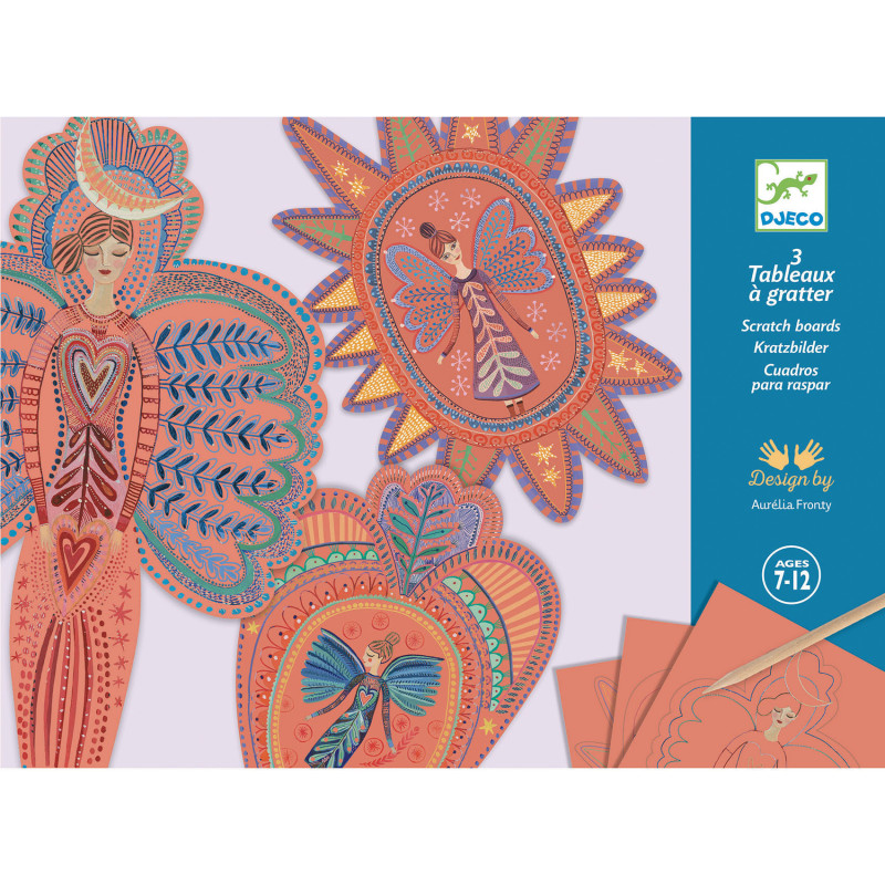 Ett kul set med tre extra stora formade kort med änglar som du kan dekorera genom att skrapa fram mönster och härliga färger. Använd skrapverktyget i trä och konstnärens instruktioner i häftet för att skrapa mönster i kortens yta och gradvis avslöja de dolda elementen i bilden. Setet innehåller. . .