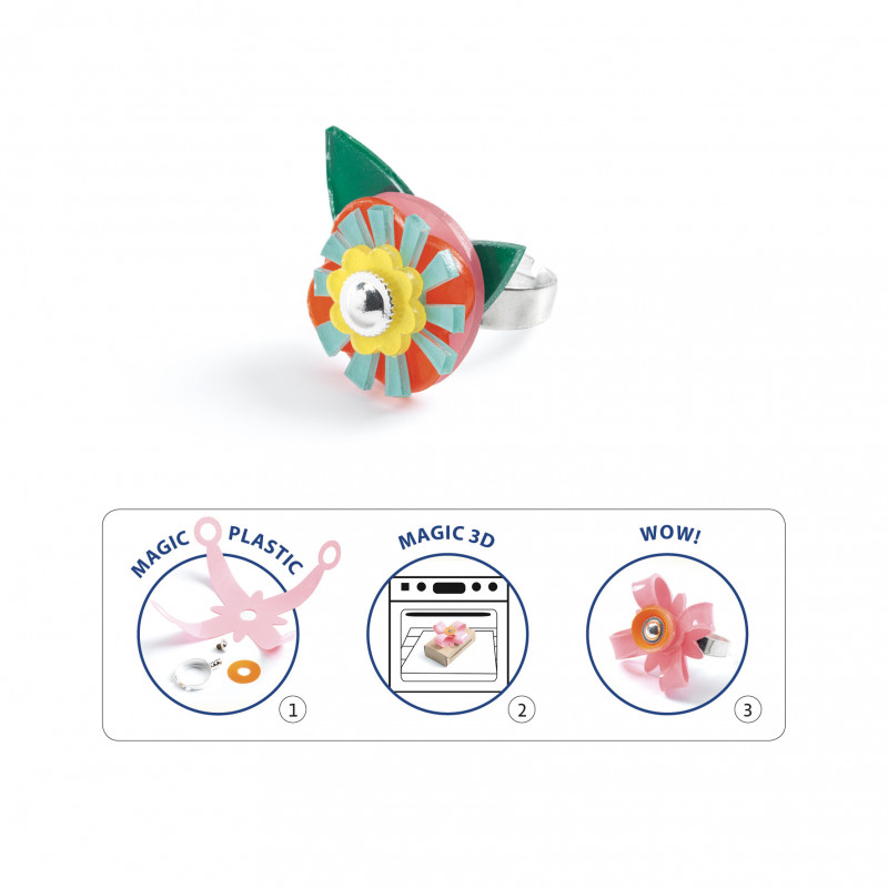 Ett kul set som låter dig skapa snygga och färgglada ringar med dekorationer i krympplast. Du kan antingen klippa ut egna former ur de hela arken eller välja bland de 46 utskurna formerna i 5 olika färger. Experimentera med tredimensionella former utifrån ett enda ark. Detta set innehåller material till 3 ringar med fast monterade dekorationer, plus 2 ringar med avtagbara dekorationer som kan bytas ut för att få olika former och effekter. Från början är delarna mjuka och flexibla, men när designen är klar sätter ni in den i ugnen
