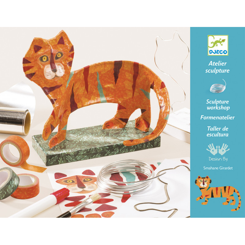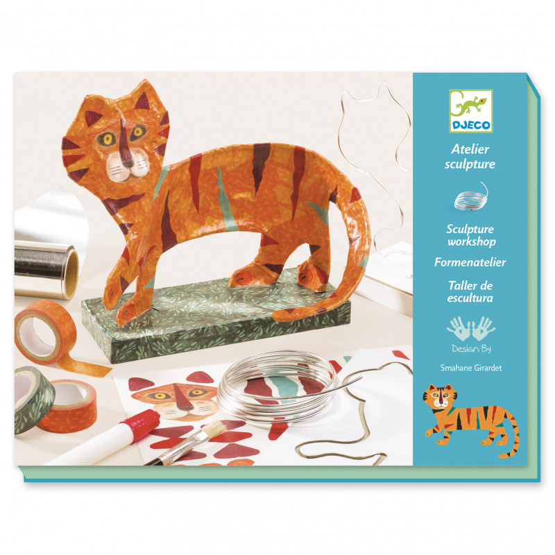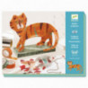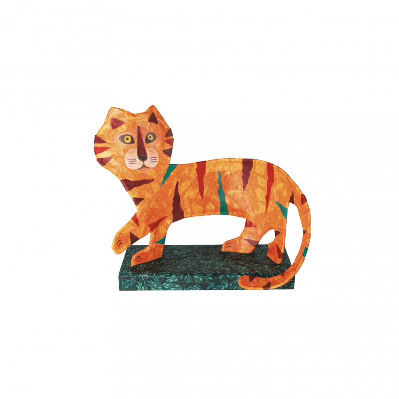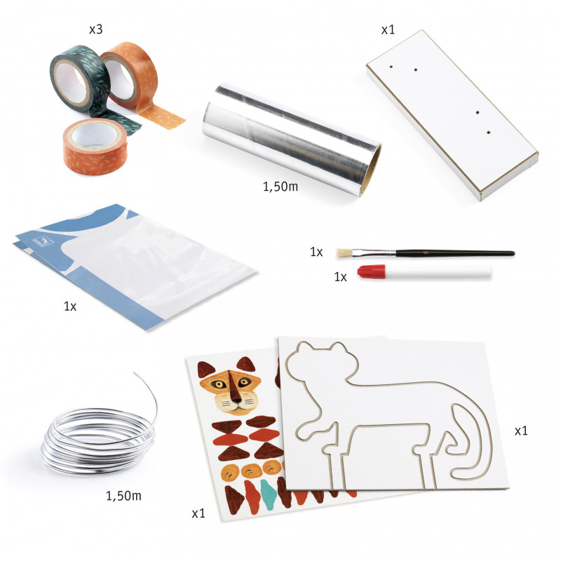 Ett nytt och annorlunda pyssel där man ska utgå från en ståltråd och i slutändan har en unik tiger figur. . Börja med att böja ståltråden till rätt form med hjälp av mallen, \"fyll i\"" tigern genom att linda folie-remsor runt ståltråden, täck sedan hela tigern med orange washi-tejp och hela bottenplattan/stativet med grön tejp, pensla på lite lack för att allt ska hålla sig på plats och när det har torkat är det bara att sätta på klistermärken för tigerns ansikte, ränder och liknande så är du klar!. I setet ingår. ."
