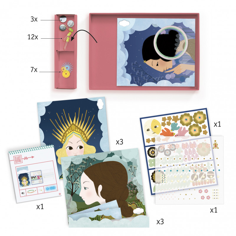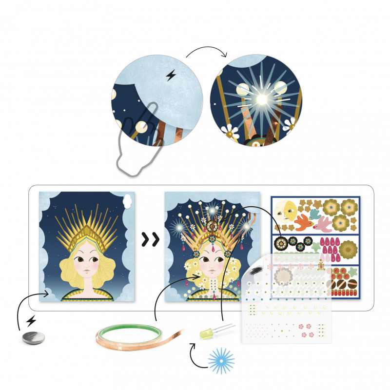 Spännande blandning av pyssel och lärande. Med hjälp av ledare som lätt klistras på motivet så gör du de fina tavlorna belysta. Med smarta strömbrytare bryter du lätt strömmen. Här är motiven fina tiaror som kommer att glittra och glimma när strömkretsarna möts.