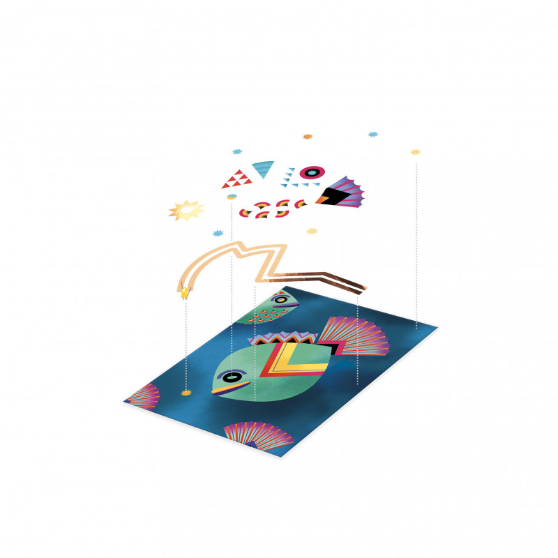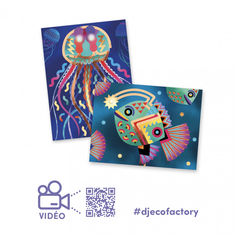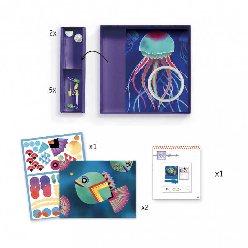 Spännande pyssel där du också lär dig om hur ett elkretslopp fungerar. Med hjälp av självhäftande ledtape och strömbrytare kan du tända och släcka ljuset i bilderna. Superkul sätt att lära sig på samtidigt som du får fina tavlor med belysning. Med motiv av fisk och manet.