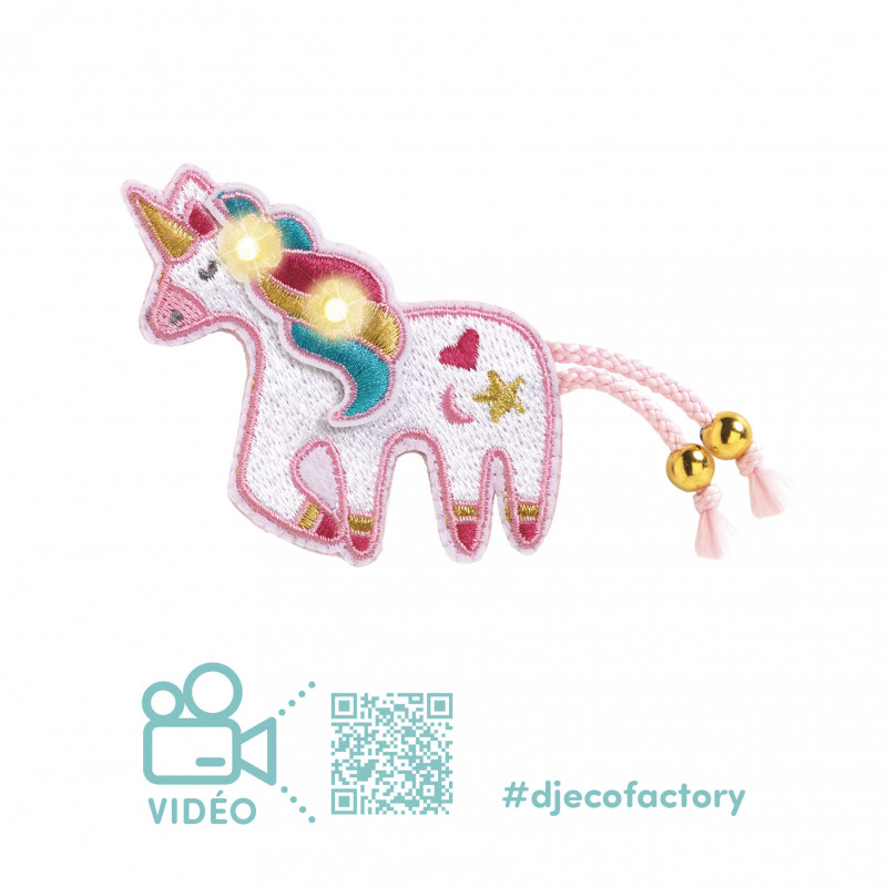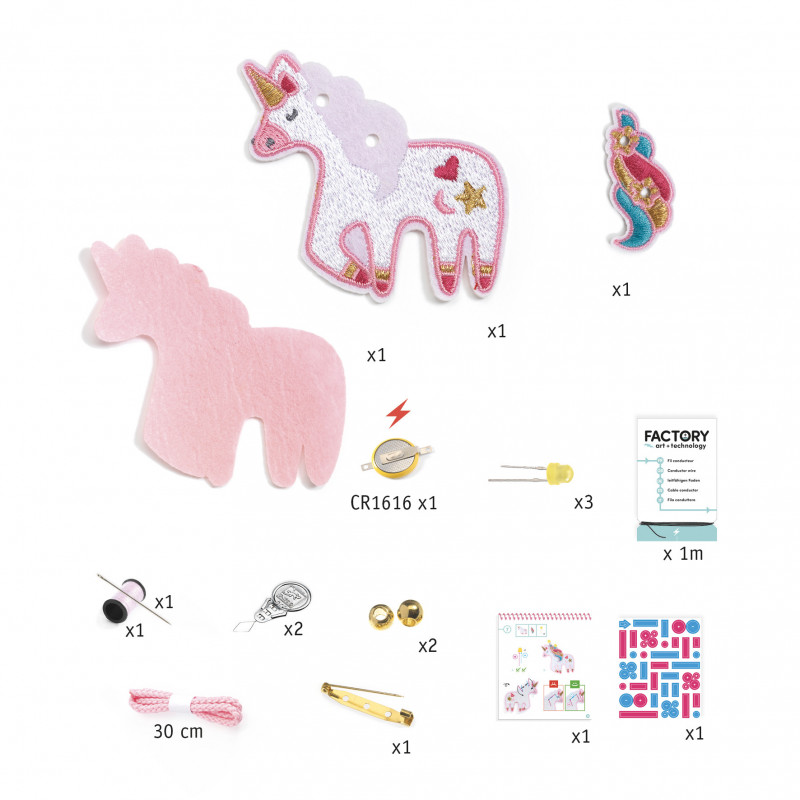 Superfin brosch i form av en enhörning med härliga lysande detaljer. Sätt ihop delarna enligt instruktionerna och sy ihop broschen så får du ett fint och annorlunda smycke. När kulorna på enhörningens svans nuddar varandra så lyser två lysdioder upp tack vare den spännande effekten av elkopplingarna som finns i smycket. Här finns alltså både roligt pyssel och tekniklära i samma roliga pysselpaket.