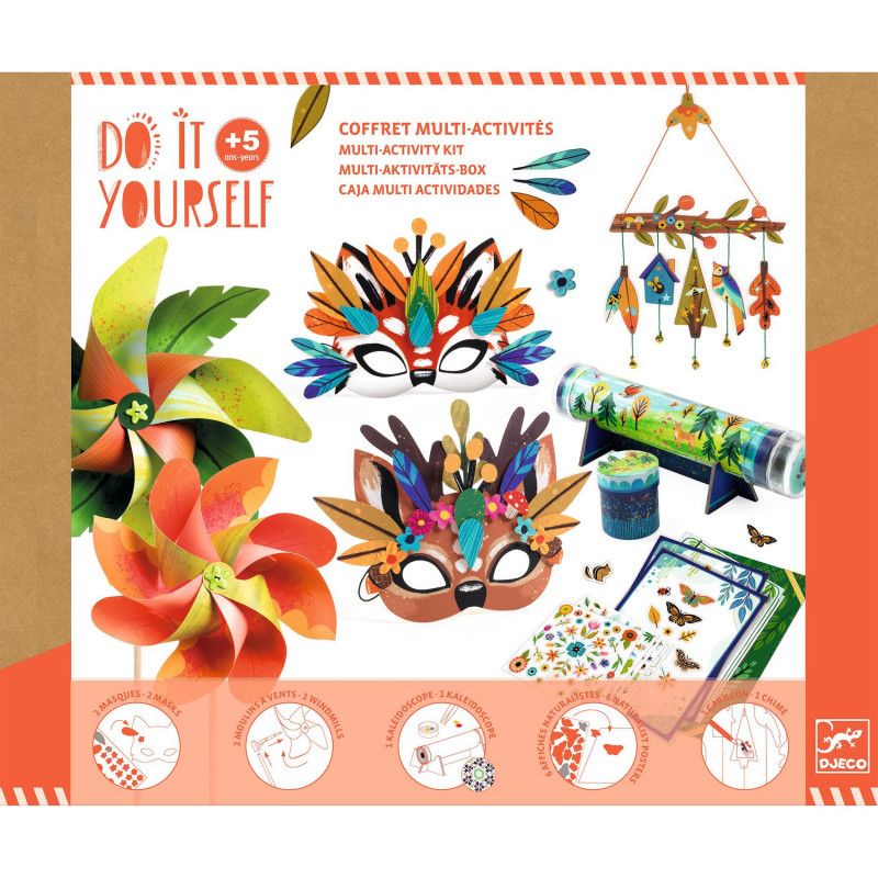 En stor pyssellåda med 5 olika slags aktiviteter där ni gör 12 roliga skapelser med naturen som tema under timmar av roligt pysslande. 2 djurmasker (ca 16 x 17 cm) att göra genom att fästa olika pappersdekorationer (perfekt att klä ut sig med!) - 2 vindsnurror att göra för att ha kul med vinden (en stor 42 x 25 cm och en mindre 39 x 23 cm) - 6 affischer (29,5 x 21 cm) med naturtema att skapa, med hjälp av illustrerade klistermärken som sorteras och klassificeras, precis som en riktig botaniker! - 1 kalejdoskop att montera ihop för att observera naturen (mer än 50 tillbehör medföljer) - 1 vacker hängande dekoration med klockspel (ca 30 x 20 cm) att montera och dekorera med hjälp av överföringsbilder, njut av att lyssna till det milda klingandet när det svajar. Timmar av roligt pyssel för att skapa föremål som små pojkar och flickor alla kommer att älska. Allt material och utrustning tillhandahålls, så att barnen kan njuta av varje aktivitet när de vill. Illustrerade instruktioner ger detaljerade steg-för-steg vägledning för varje aktivitet och skapelse med hjälp av färgbilder. Dessa aktiviteter kan både ensam och tillsammans med andra, till exempel på ett kalas eller en sammankomst. Tillverkat av FSC®️ certifierat papper och kartong. Innehåll: *2 masker att dekorera - 3 pappersark med 80 illustrerade och utstansade dekorationer, 2 ark med dubbelhäftande fästkuddar, 2 elastiska band . *2 vindsnurror att göra - 4 utstansade kartongark med illustrerade delar, 2 träpinnar i olika längd, 2 set med fästen i plast. *1 kalejdoskop att montera - 1 illustrerat rör, 3 speglar, 1 genomskinlig behållare med lock för utvalda dekorationer och bakgrund, 1 lins, 1 pincett, 11 runda illustrerade skivor med bakgrunder, 1 förvaringsbox, 50 små blandade dekorationer, 1 illustrerat förvarings-ställ. *6 affischer med naturtema att skapa - 6 delvis illustrerade ark (29,5 x 21 cm), 4 ark med klistermärken av vilda djur och natur,1 ark med etiketter, 1 förvaringsmapp. *1 hängande klockspel att dekorera och montera - 7 illustrerade delar med hål, 2 buntar färgat bomullssnöre, 5 bjällror i metall, 2 ark med överföringsbilder att dekorera med. Från +5 år.