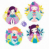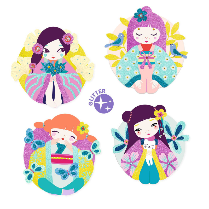 Ett vackert pyssel set med fyra stora utstansade medaljonger illustrerade med bilder av tjejer i Asien-inspirerade utstyrslar och med självhäftande ytor att dekorera med glitter och mini strass. Välj en av bilderna och placera den i lådan, pilla bort skyddspappret från de klistriga områden som har samma färgkod eller som du vill ha i samma färg, strö över glitter så att områdena täcks, korrigera med hjälp av penseln och häll av överblivet glitter. Lådan har en öppning i ena hörnet som gör det lättare att hälla tillbaka överskotts-glittret i sin behållare och ser i övrigt till att glittret inte sprider sig över rummet (eller hela hemmet). Sedan fortsätter du färg för färg medan du placerar ut dekor-stenarna där du vill ha dem och resultatet blir en härligt glittrig bild i skimrande färger. För att visa upp verket fäster du sedan en av de små självhäftande upphängningsbeslagen på baksidan och kan hänga bilden på en spik eller i ett snöre där du kan beundra den. Djeco har utvecklat ett litet fiffigt verktyg speciellt för att göra det lättare att pilla bort skyddspappret lättare och glittret kommer i behållare som liknar ströare vilket ger större precision när du strör ut glittret. Förvaringslådan har ett resårband som håller den stängd och materialet på plats när aktiviteten är över och sakerna har lagts tillbaka i lådan. Innehåll: 4 illustrerade och formade kort med klistriga områden under skyddspapper (ca 21 cm i diameter), 4 behållare med glitter (rosa, guldgul, blå, turkos), 1 behållare med mini strass i blandade storlekar och färger, 1 verktyg i plast, 1 pensel, 4 självhäftande upphängningsbeslag, 1 häfte med inspiration och steg-för-steg instruktioner i färgbilder, 1 förvaringslåda att arbeta i. Från +6 till 10 år.