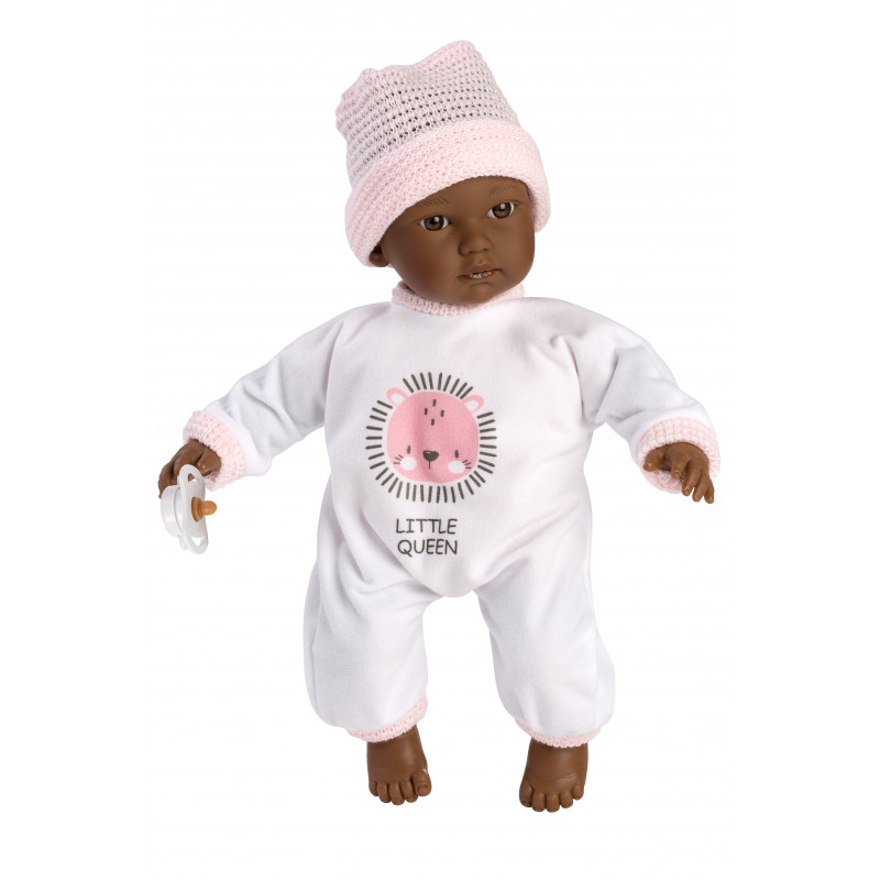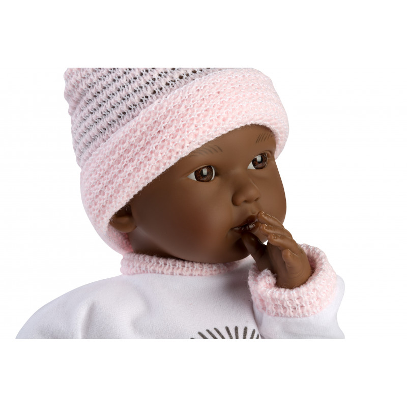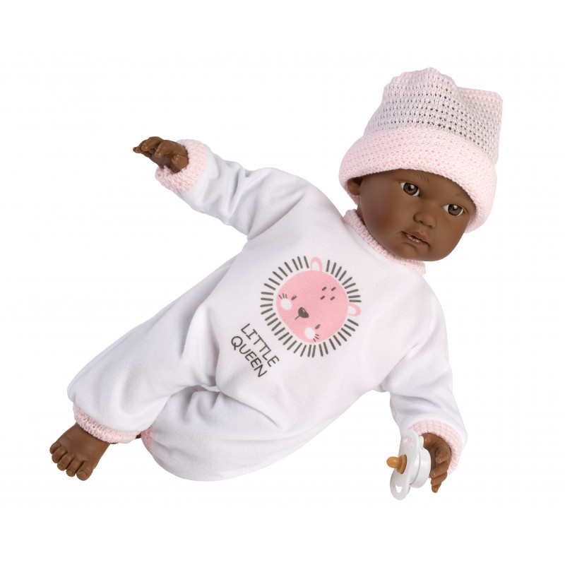 Line är klädd i vit sparkdräkt med rosa tryck och stickad rosa mössa. Dockan har ljud och gråter när man trycker på magen. Napp ingår.