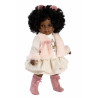 Färg: Mörk hy, svart krulligt hår, vit tröja, rosa jacka, svart kjol, grå strumpor