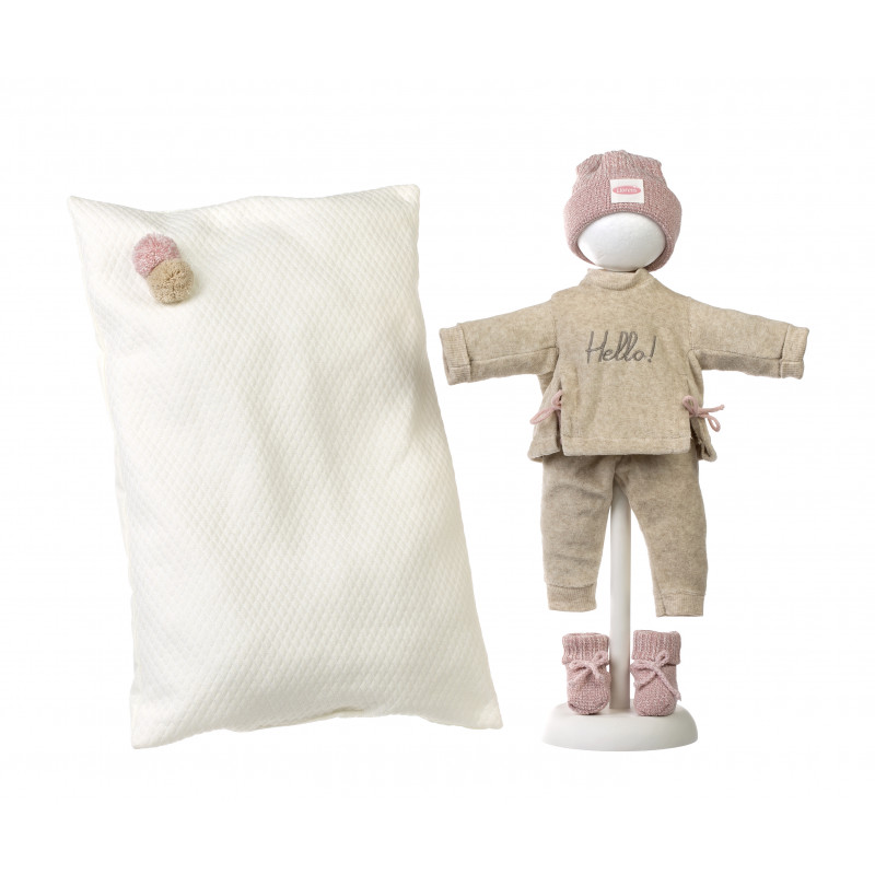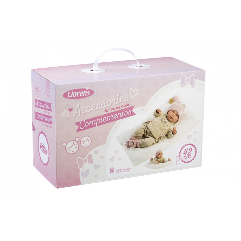 Tillbehör och kläder från spanska Llorens. Passar till babydocka storlek 42 cm.