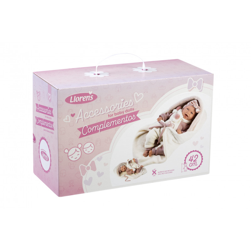 Tillbehör och kläder från spanska Llorens. Passar till babydocka storlek 42 cm.
