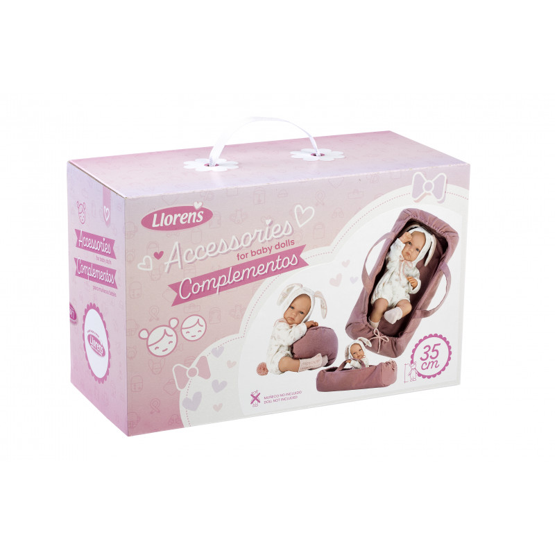 Tillbehör och kläder från spanska Llorens. Passar till babydocka storlek 35 cm.