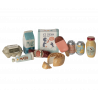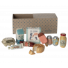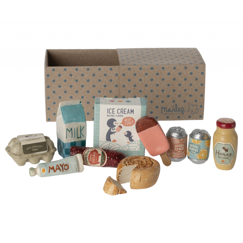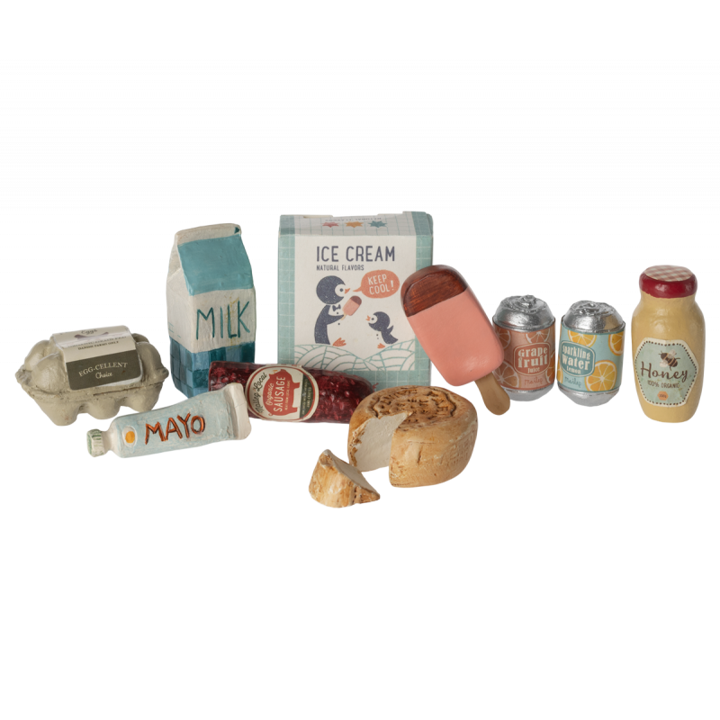 All mat som din Maileg-vän kan tänkas behöva. Detta urval av mat inkluderar majonnäs, mjölk, honungsburk, korv, 4 glasspinnar, äggkartong, 2 läskburkar och en ost. Den kommer att levereras i en kartong.