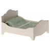 En fin Maileg träsäng med blommigt mönstrat täcke och örngott.