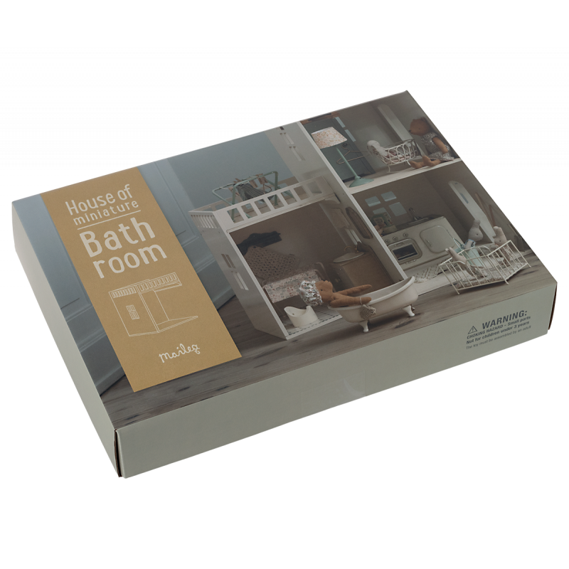 I Mailegs miniatyrbadrum finns ett fint dekorerat golv och fina gardiner. Nu kan dina små Maileg-vänner äntligen bada ifred.Möbler och docka köps separat.