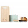 Ett fint miniatyrset från Maileg innehållande en mintfärgad brödbox i metall, brödlimpa med 3 brödskivor, kniv och skärbräda.