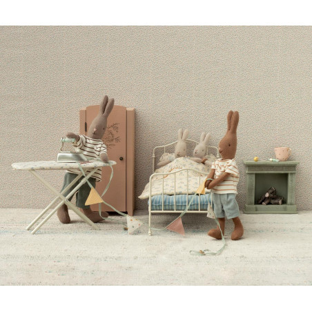 En perfekt säng för en god natts sömn. Sängkläderna är tillverkade i vackra Maileg-tryckta tyger. Denna säng passar kaniner i storlek 1 och 2.