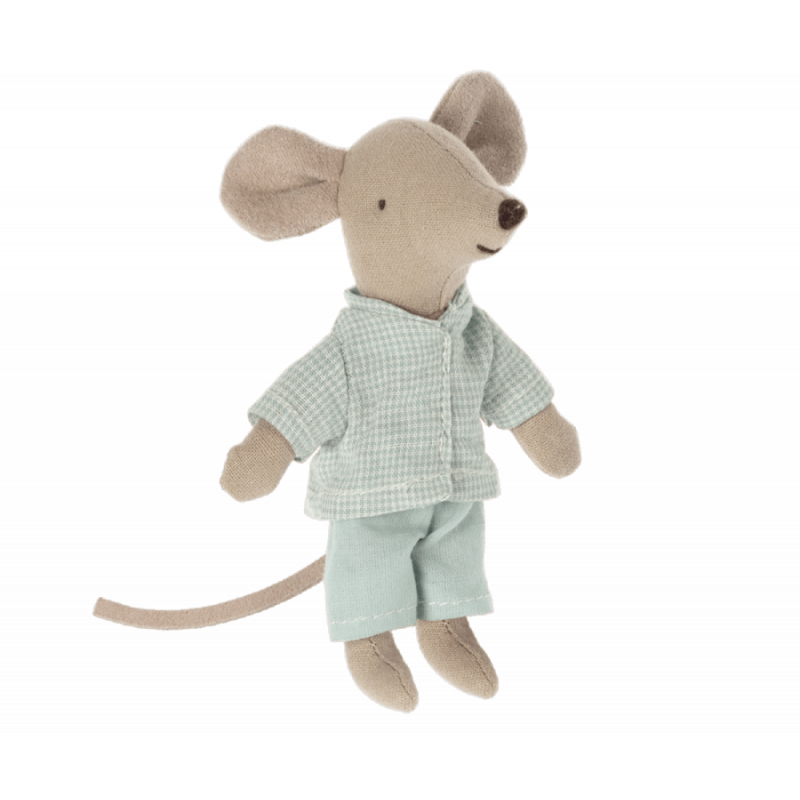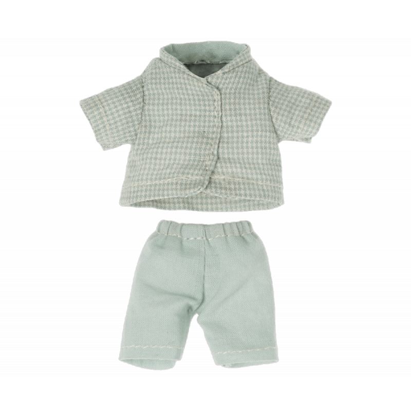 En mjuk och skön tvådelad pyjamas i blått bomullstyg. Pyjamasen passar Mailegs djur i måtten ca 10cm. Musen köpes separat.