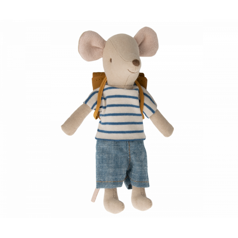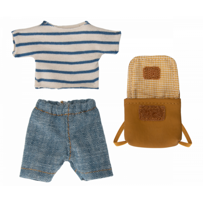 Kläder till Mailegs möss, blå shorts, blå randig tröja och en liten ryggsäck. Passar möss och kaniner med måttet ca15cm.