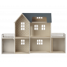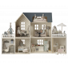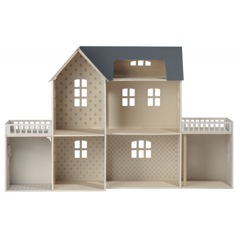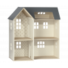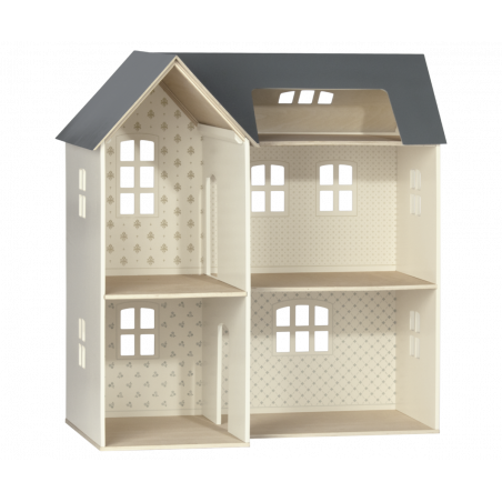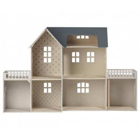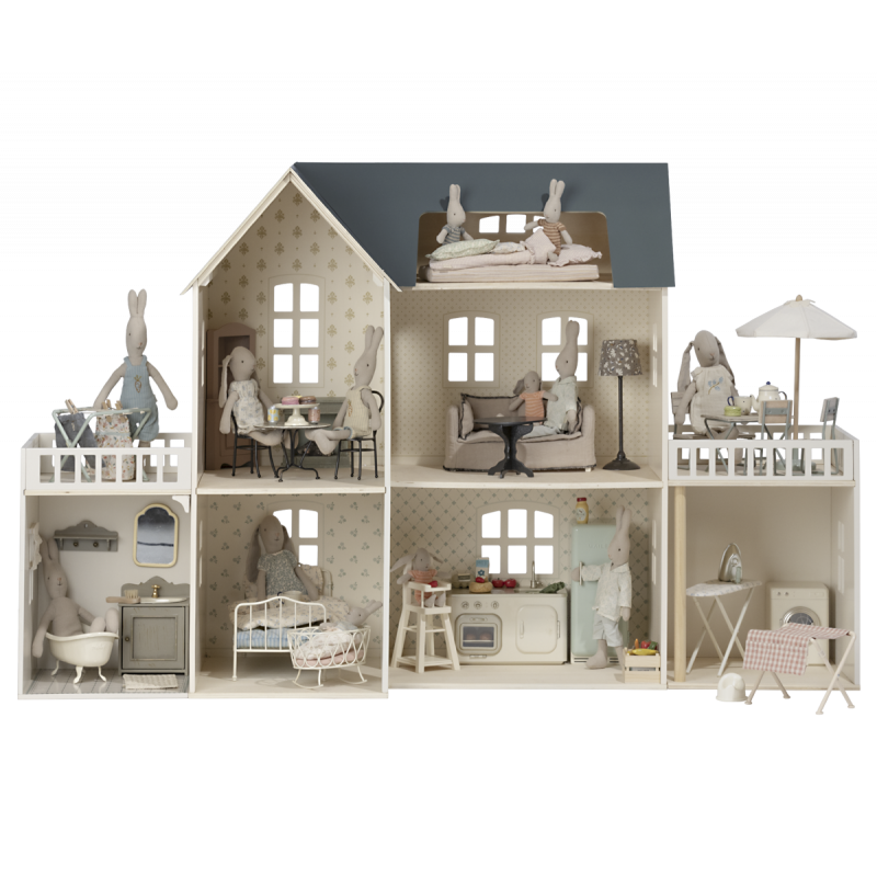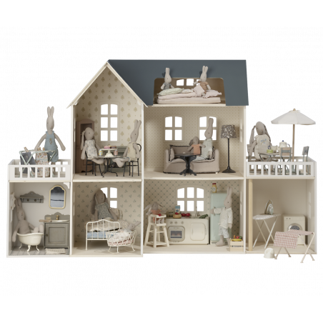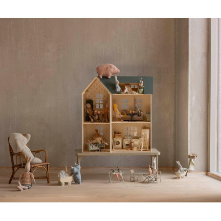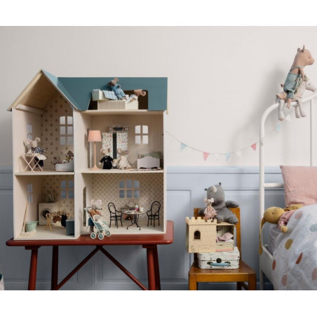 Maileg dockhus med vackert dekorerade väggar. Produkter som passar in i huset: Kanin/Kanin storlek 1, 2, micro, my, Nallefamiljen och möbler och tillbehör i miniatyrstorlek.