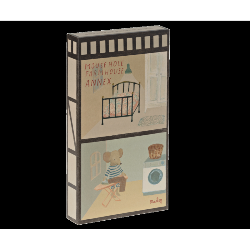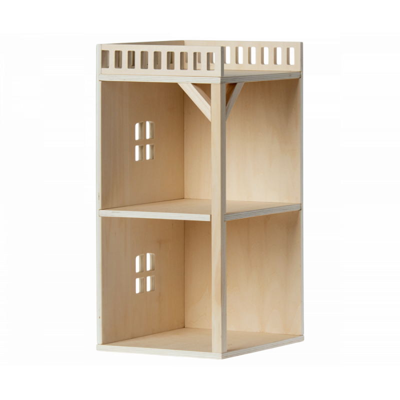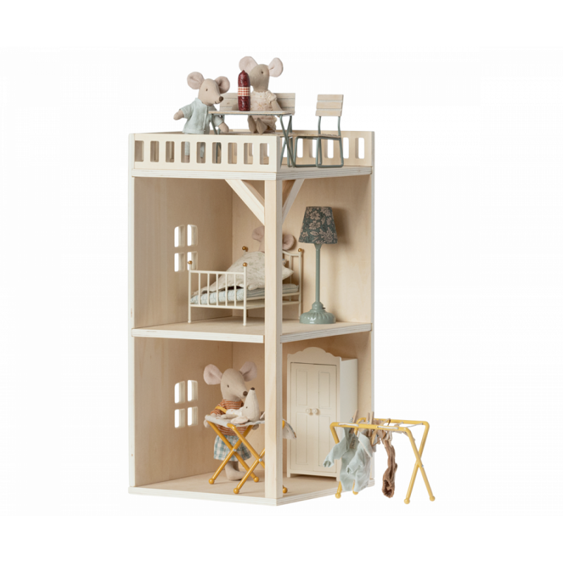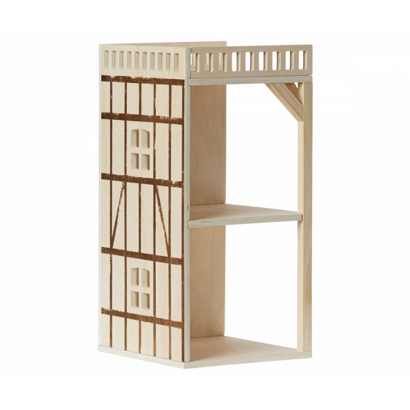 När musfamiljen växer behhövs det mer utrymme. Detta annex har två våningar och en mysig terrass överst. Möbler och möss säljs separat.