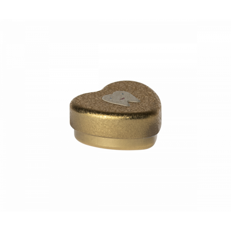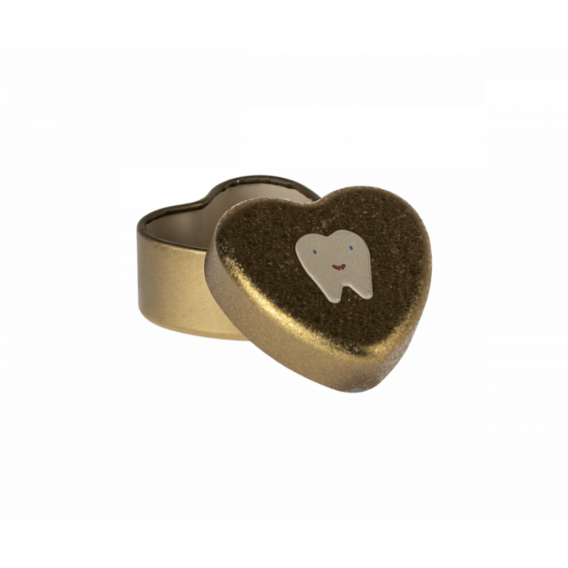 Detta fina metallhjärta i guldfärg är det perfekta stället att förvara t ex små tänder. Asken har en söt tand som dekoration på locket, som har en krackelerad yta.