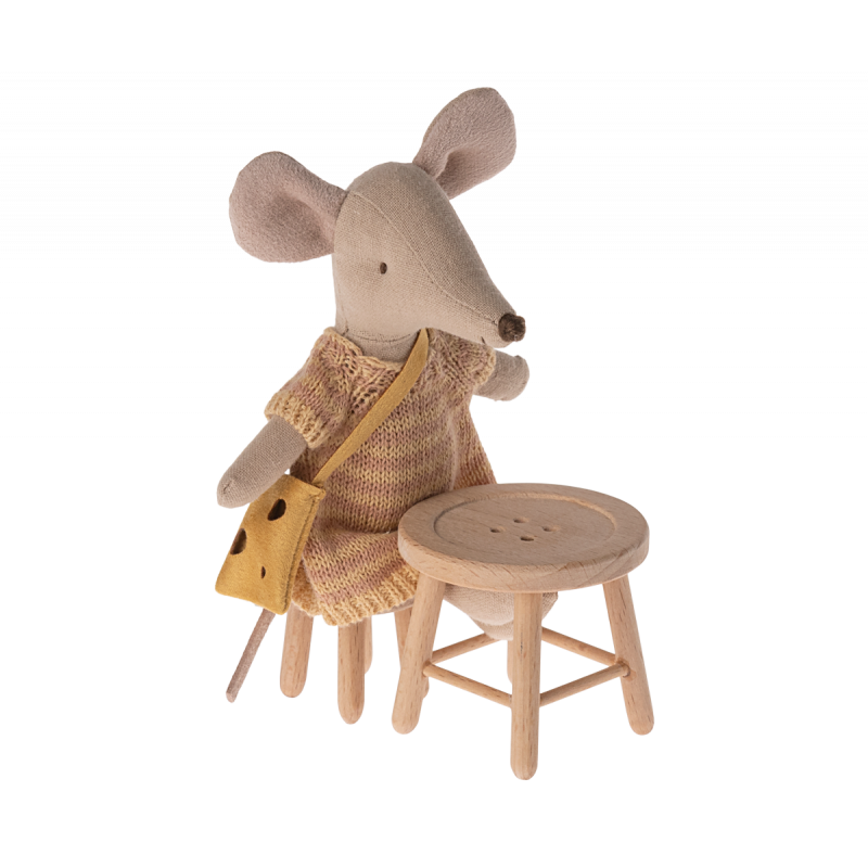 Ett set med pall och bord för musfamiljen. Den är inspirerad av knappar och kan blandas med andra mössmöbler och tillbehör för att skapa ett härligt hem. Den passar perfekt in i Mouse hole Farmhouse.