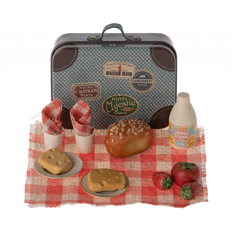 Ta med dina mjuka vänner på picknick oavsett om det är i skogen, trädgården eller lekrummet. Detta set kommer i en liten resväska av metall och innehåller allt du behöver av mat och servis för en härlig måltid. Små variationer kan förekomma i målningen.