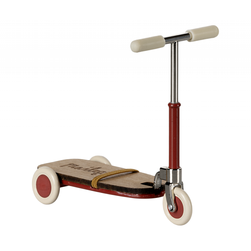 En kickboard med trädetaljer. Kickboarden har en metallpinne i styret som ser till att möss med magneter i händerna kan stanna på brädan. En liten resår på brädan ser till att säkra mössens fötter på brädan under åkturen.