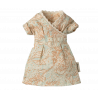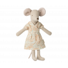 En klassisk Maileg-vara; Mamma mus i en ljus klänning. Denna mus passar möbler och tillbehör i storlek mus. Köp fler kläder separat. Kläder i storlek mamma/pappa passar denna mus.