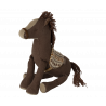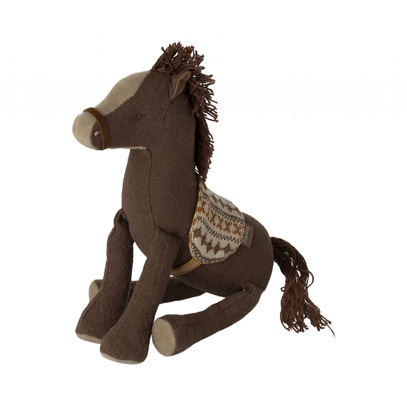 Den bruna ponnyn är tillverkad i ett mjukt bomulls-/linnetyg. Manen och svansen är av bomullstrådar och sadeln är tillverkad i mjukt stickat tyg som garanterar en bekväm ridtur.