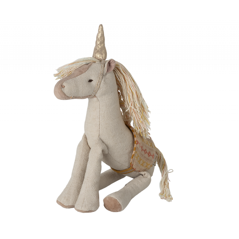 En magisk historia börjar snart. Med denna enhörning i färgglada toner och ett gyllene horn finns det många historier att berätta. Enhörningen levereras med en sadel för en bekväm åktur.