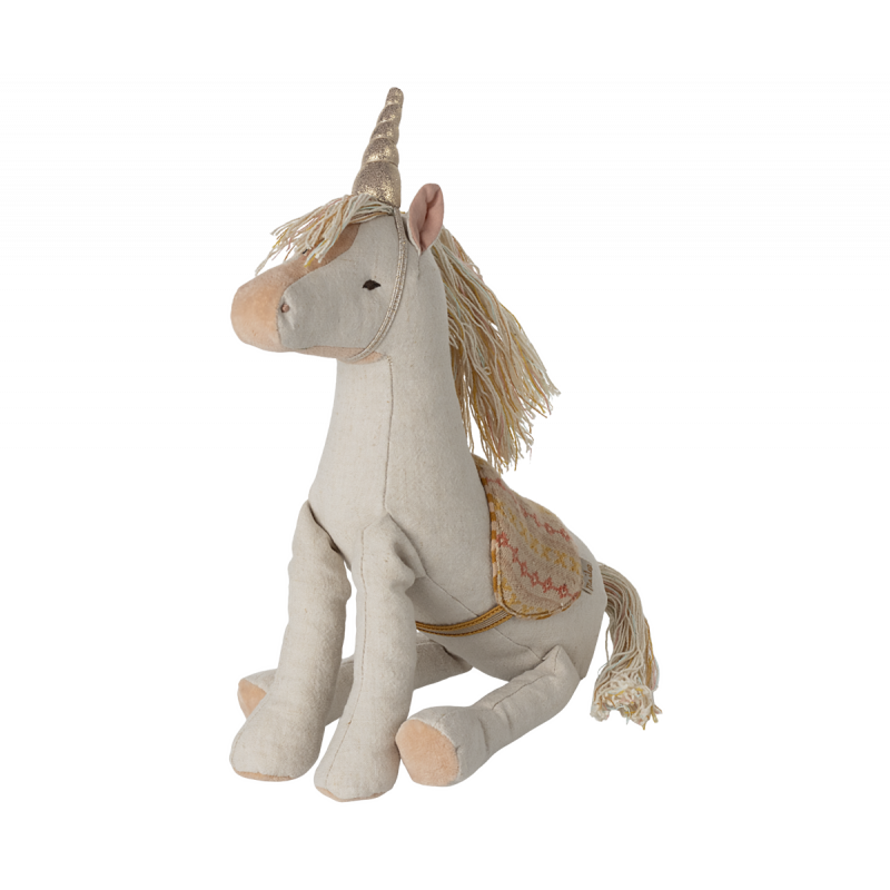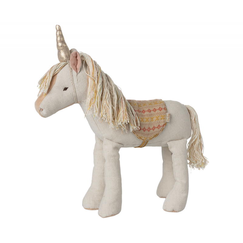 En magisk historia börjar snart. Med denna enhörning i färgglada toner och ett gyllene horn finns det många historier att berätta. Enhörningen levereras med en sadel för en bekväm åktur.