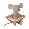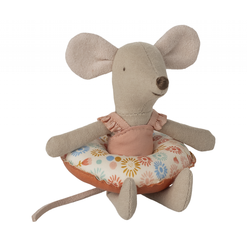 Detta sommarset består av en lillasyster mus klädd i en rosa baddräkt med sin blommig badring runt magen. Hon är nu redo för ett säkert dopp i havet.