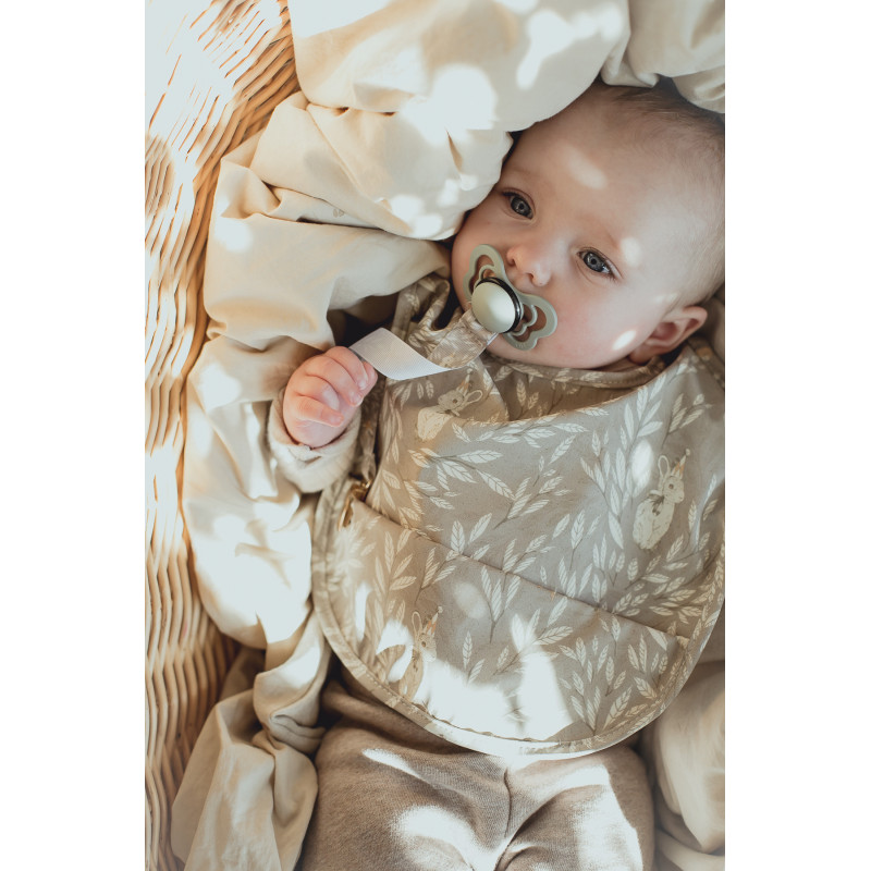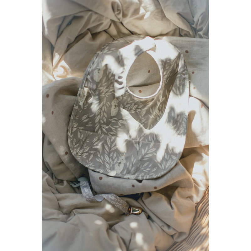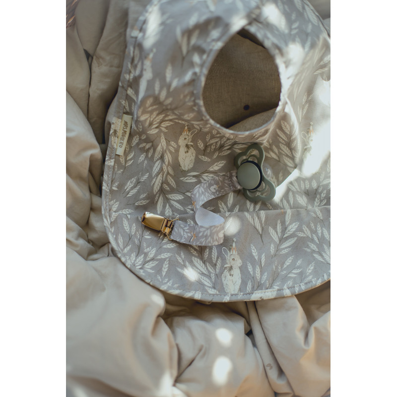 En följsam och praktisk haklapp designad av Mrs Mighetto. Haklappen är matt till utseendet men har en glatt yta vilket gör den enkel att torka av, i nederkant finns en ficka som fångar upp eventuellt spill. Haklappen stänger man enkelt i nacken med kardborre.
