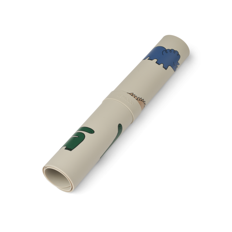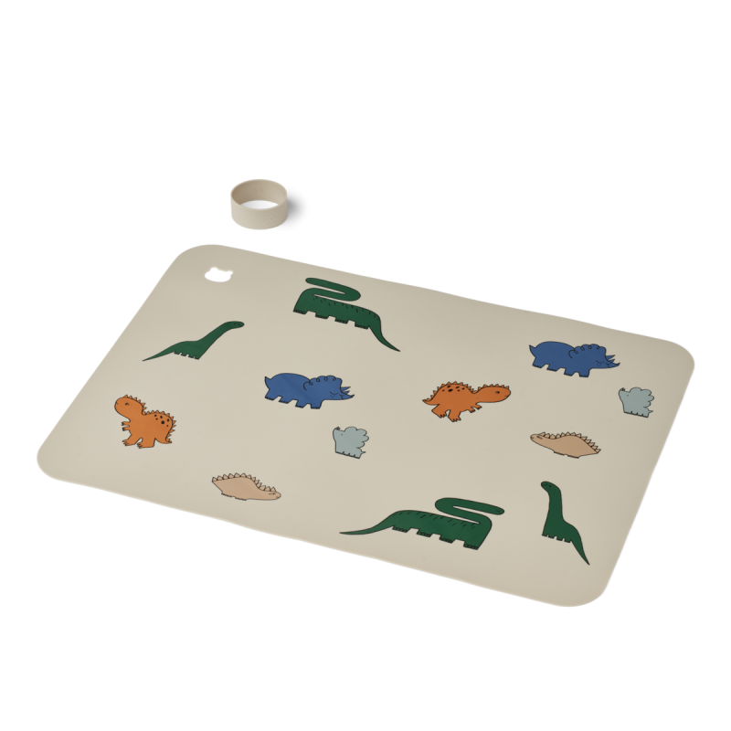 Underlägg för en matstund med motiv av dinousaurier. Tillverkat i silikon och som lätt kan hängas upp i hålet i ena hörnet. Hållbart underlägg och som kan tvättas i diskmaskinen.
