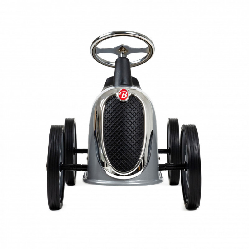 Elegant design i silverfärgad metall med kromgaller i retrostil. Barnet sitter bekvämt på sin rider som är stabil och robust.