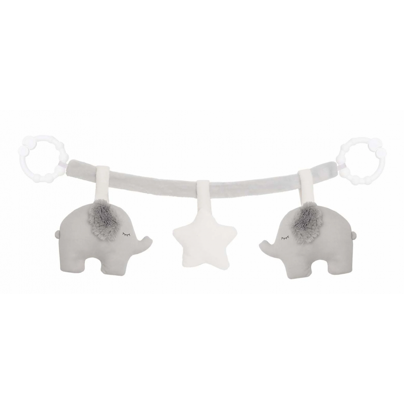 Barnvagnshänge med söta elefanter i grått. Barnvagnshänget är en rolig och stimulerande underhållning för barnet under promenaden. Passar såväl till barnvagnen som till babysittern eller babyskyddet i bilen. Fästs enkelt med elastiska ringar. Tillverkad av 100% polyester och fyllning polyester fiber.