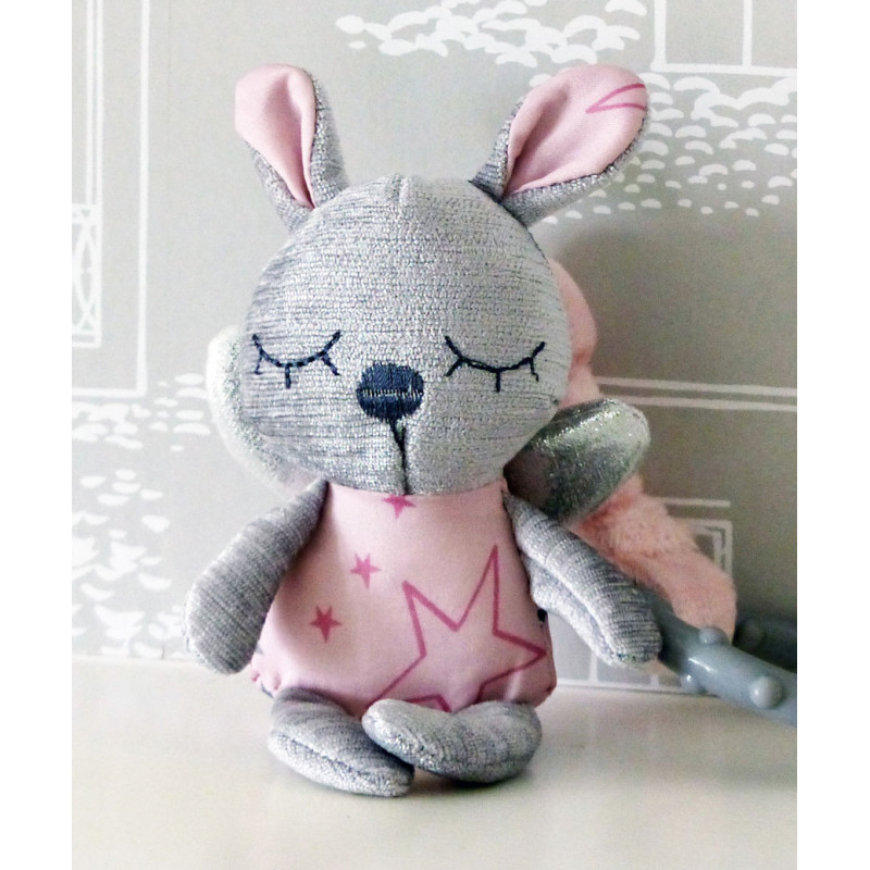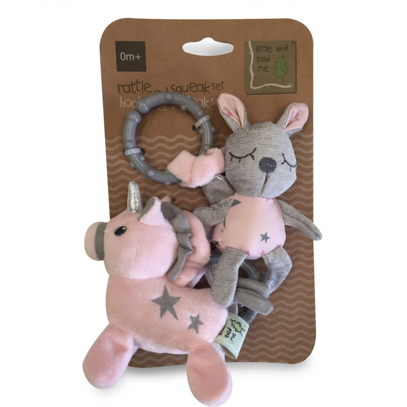 Gulligt set innehållande Far fairy som skallrar och enhörningen Celeste enhörning som piper när du trycker henne på magen. Tillsammans har de tyg täckt av stjärnor i fina nyanser av grått och rosa, med inslag av annat material i silver och metallic för taktil stimulering.