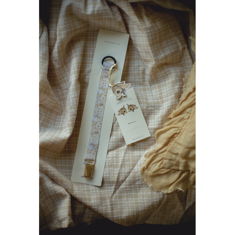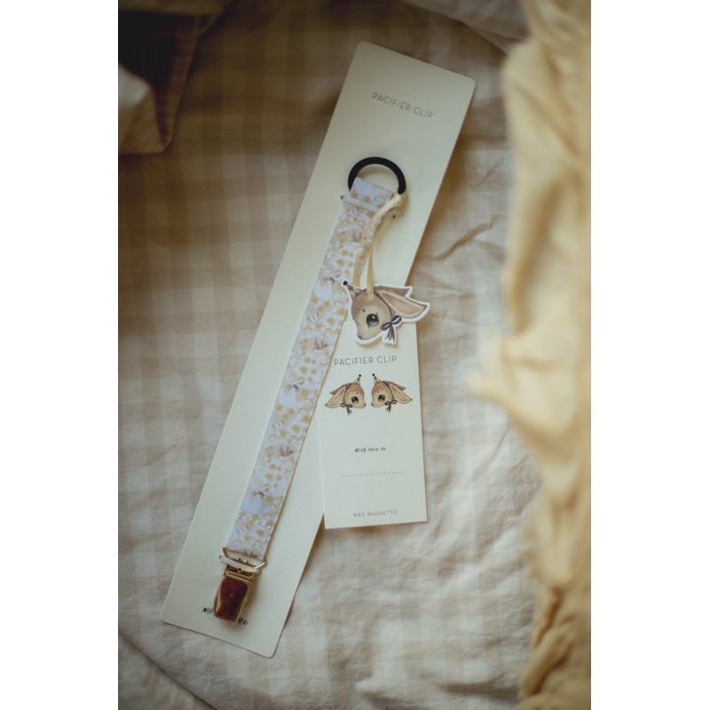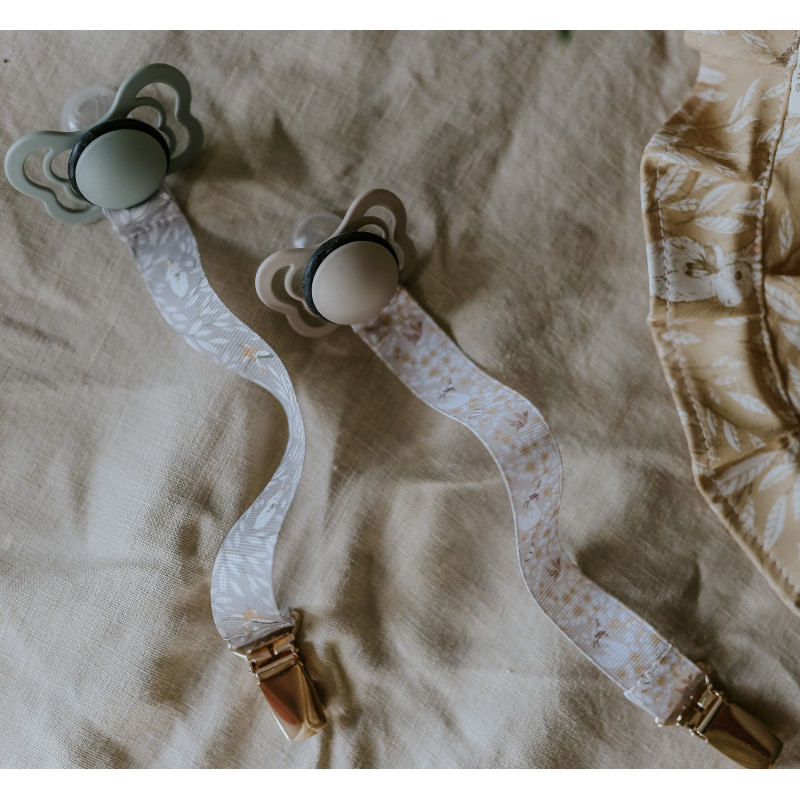 Med den här napphållaren från Mrs Mighetto ser du till att alltid ha nappen nära till hands och att den inte och försvinner. Napphållaren har en elastisk silikonring som antingen träs genom ringen på nappen eller över den lilla knappen som sitter mitt på.