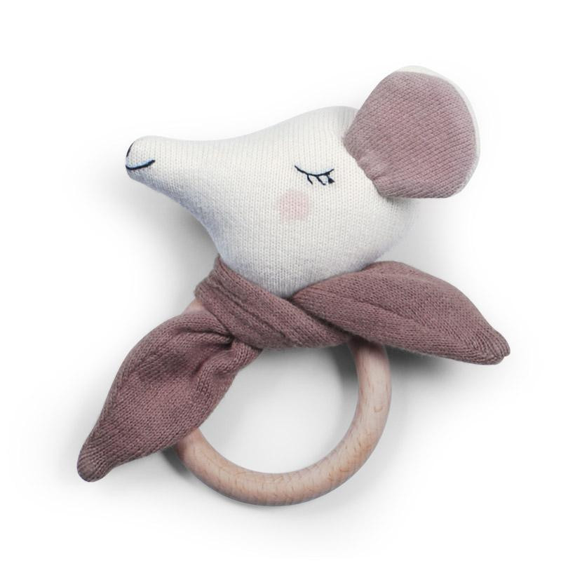 Den här söta bitringen föreställer en sovande mus, mjuk och rolig att undersöka för dom små händerna.