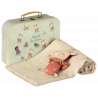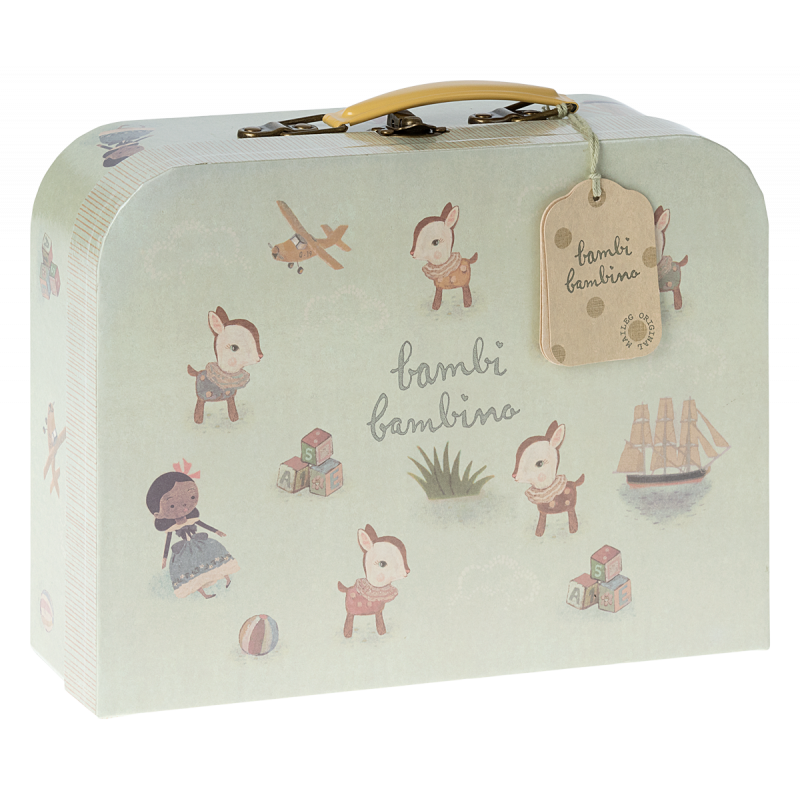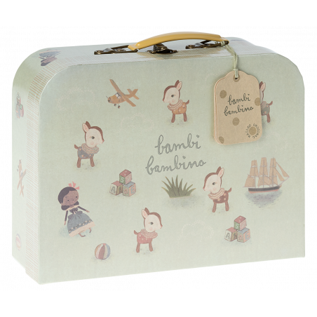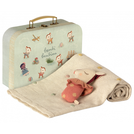 Detta vackra babypresentset innehåller en Bambi skallra och en mjuk stickad filt i OEKOTEX bomull. Den kommer i en snyggt dekorerad handgjord resväska.