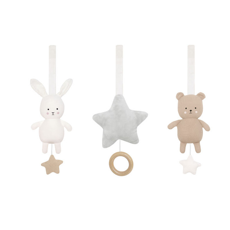 Bedårande babygymleksaker, innehåller en nalle, en stjärna och en kanin. Stjärnan spelar en vaggvisa för den lilla bebisen och i kaninen finns en liten skallra med dovt ljud. De intressanta formerna och färgerna kommer roa och underhålla bebisen. Tygleksakerna fästs enkelt med kardborre och de kan därför flyttas med och fästas varhelst man önskar. Passar till alla sorters babygym.